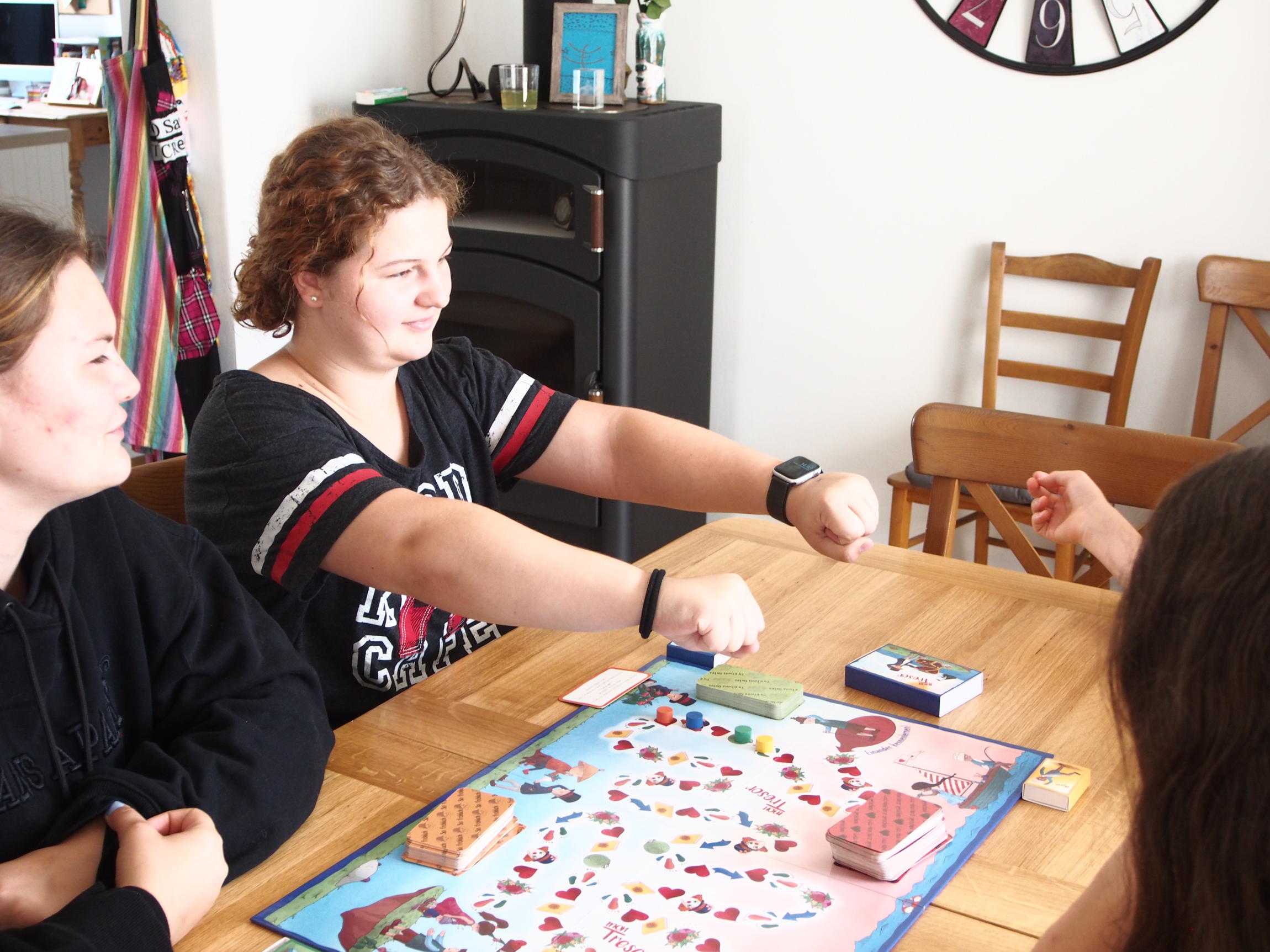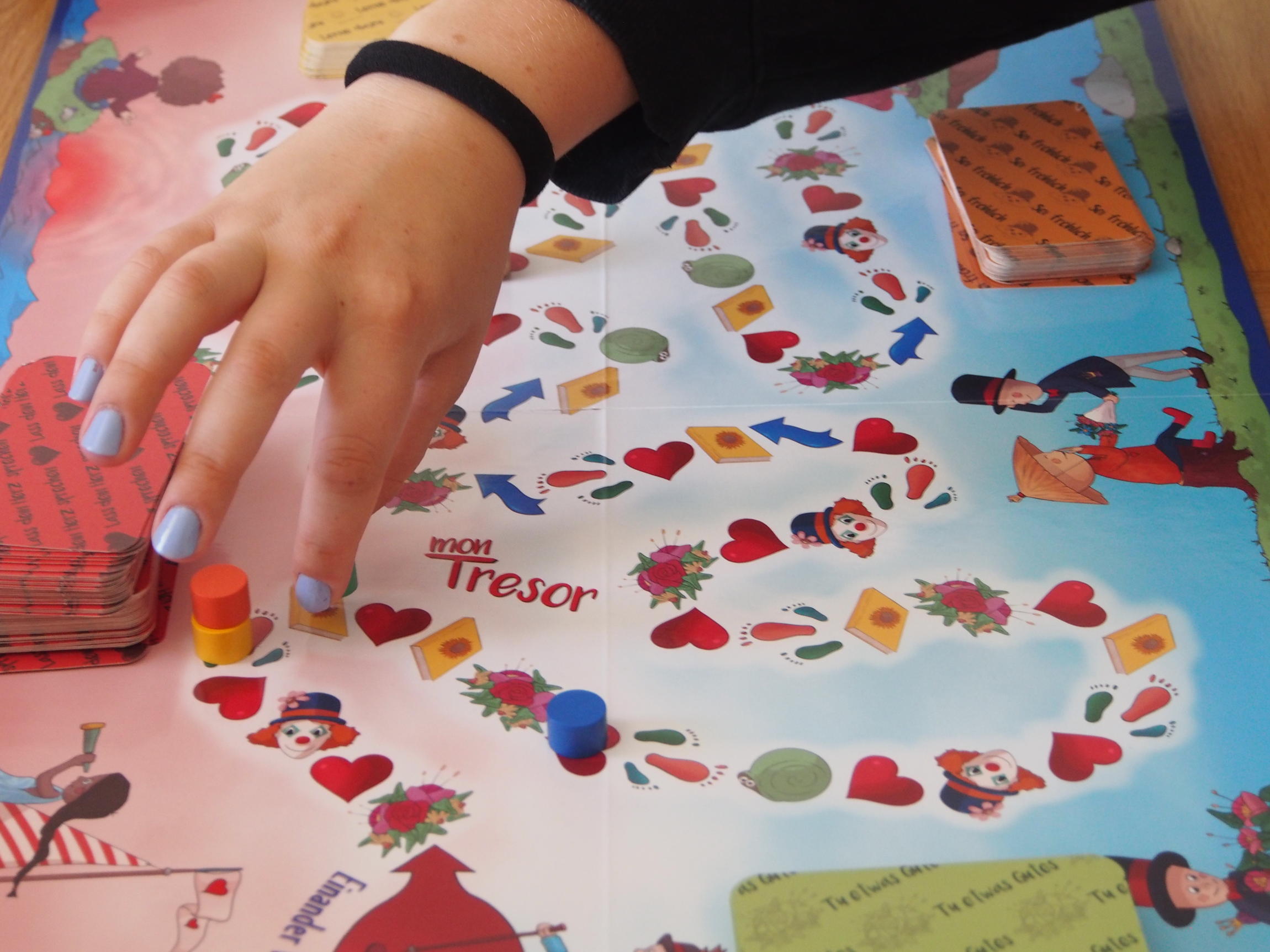 | Kommst du auf das Symbol „Rotes Herz”, wirst du mit Edelsteinen beschenkt. Nimm dir vom Stapel „Lass dein Herz sprechen” eine Karte und lies die Frage laut vor. Nachdem du dein Herz hast sprechen lassen, darfst du dir aus der Schatztruhe so viele Edelsteine nehmen, wie auf der Karte angegeben sind. Bewahre diese in deinem Schatzkästchen „Mon Tresor“ auf. Die Karte wird nach Gebrauch unter den Stapel zurückgelegt. | |