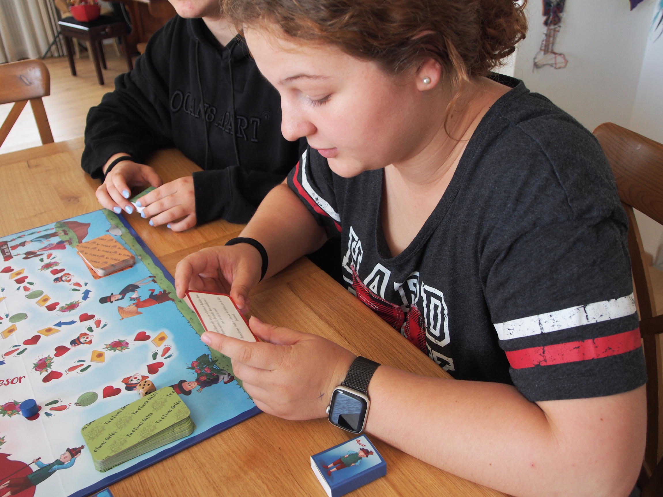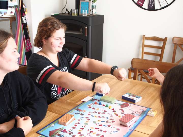 Kommst du auf das Symbol „Buch”, so nimmt dein rechter Sitznachbar die oberste Karte vom Stapel „Lerne dazu” und liest dir zuerst die Frage und dann die Antworten, die zur Wahl stehen, laut vor. Nun bist du an der Reihe und du darfst raten.